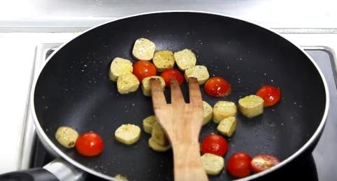 2. En otra sartén sofríe unos cuantos tomates cherry y unas salchichas de tofu veganas.