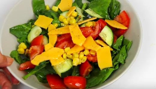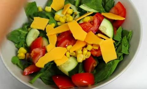 2. En un bol de ensalada añade: un puñado de espinacas, el tomate y pepino cortados, 3 cucharadas de maíz y unos trozos de queso vegano. Sazónalo con sal, pimienta y aceite al gusto.