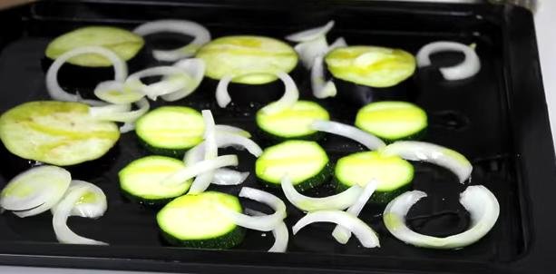 1. Corta: 1/4 cebolla, 1/2 calabacín y 1/2 berenjena.