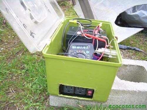 En este caso, dado la poca potencia de esta placa solar casera, yo usaría directamente la corriente de 12v continua que se obtiene de las baterías ahorrando, así la colocación del inversor.