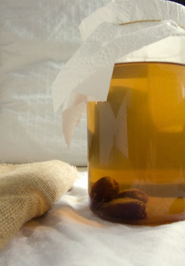 *Llenar el recipiente con un litro de agua no clorada y remover con un utensilio que NO sea de metal. Cubrir el recipiente con un trapo o papel de cocina. Si queréis que la bebida quede más carbonatada dejar un tercio del recipiente con aire y taparlo herméticamente, pero vigilar porque el gas generado durante la fermentación (dióxido de carbono) podría hacer estallar el recipiente. Dejar reposar la mezcla a temperatura ambiente y protegida de la luz solar.