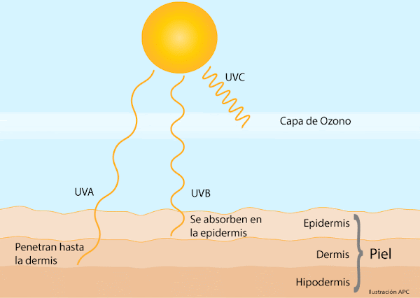 UVB: llegan sólo a la epidermis. Son los que producen las QUEMADURAS Y ALGUNAS AFECCIONES GRAVES COMO EL CÁNCER. La CAPA DE OZONO filtra en parte algunos de estos rayos. Son los responsables de la SÍNTESIS DE LA VITAMINA D.