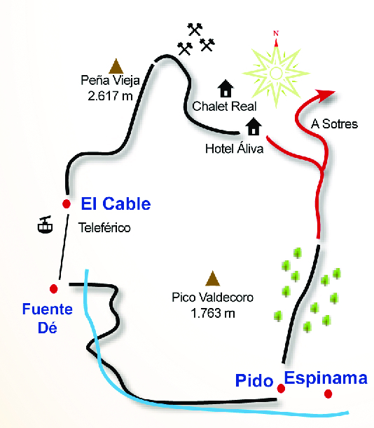Mapa del recorrido entre Fuente Dé y el hotel Áliva. La pista está entre Espinama y Áliva.