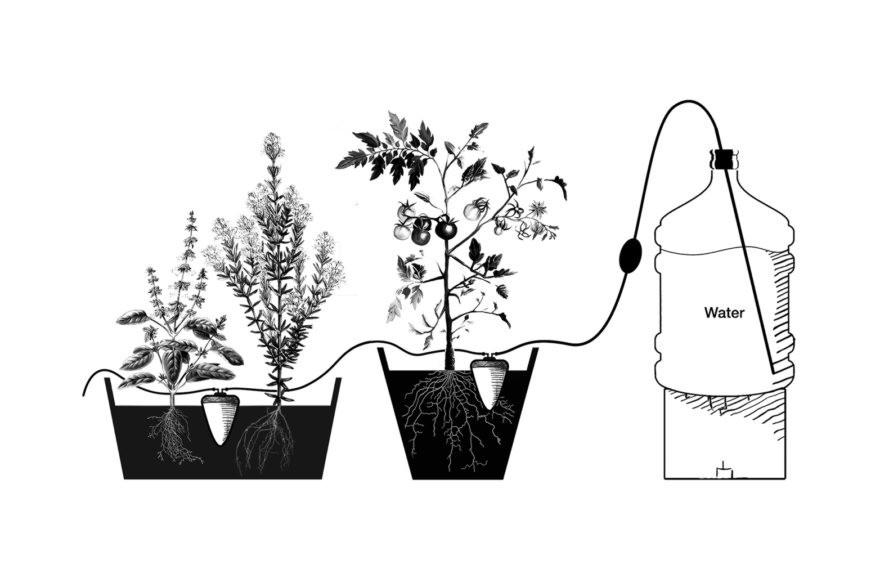 Los crisoles de cerámica son enterrados parcialmente cerca de la planta y conectados por tubos que a su vez conectan a una fuente de agua en un lugar más alto. Una bomba de acuario pequeño recibe el flujo de agua y luego todo el trabajo es debido a la gravedad.