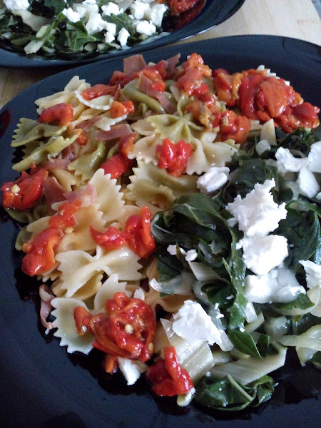 En este punto añadiremos las acelgas al plato y en la misma sartén en la que cocinamos las verduras añadimos una cucharadita de aceite de oliva, el jamoncito picado y la pasta escurrida. Damos unas vueltas y al plato. Luego adornaremos con los pimientos y el queso de cabra.