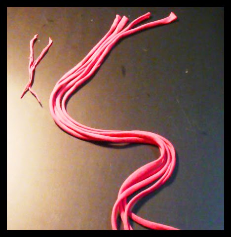 Las 4 tiras las unimos, tiramos de una de ellas un poquito y le hacemos un arito. Cogemos las 3 tiras y la del arito y las atamos con una de las tiras finas. Cortamos los sobrantes.