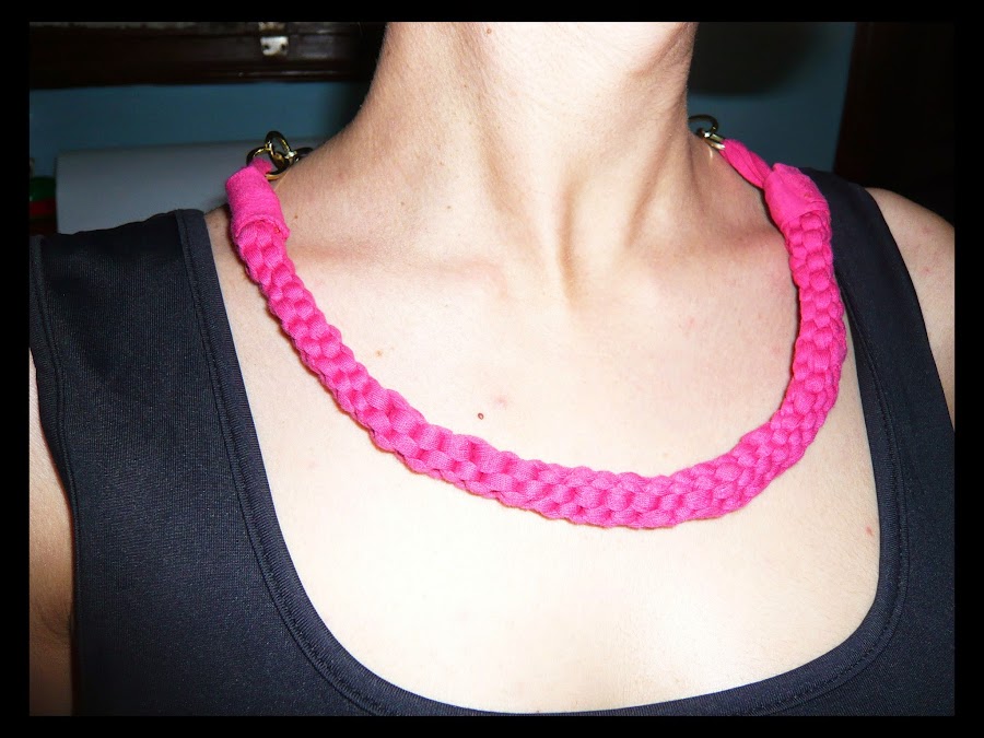 Como estoy haciendo últimamente, me despido de la semana con una manualidad, o DIY, como parece que se llaman ahora. Como tuvo tanto éxito el tutorial de la diadema con trapillo, hoy os traigo otro DIY con trapillo, un collar.