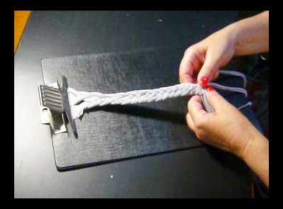 Cogemos los 5 cabos de las tiras con fiso o pinzas para facilitarnos el trabajo y comenzamos a trenzar. Cuidado de poner todas las tiras con la misma orientación. El orden es el siguiente: