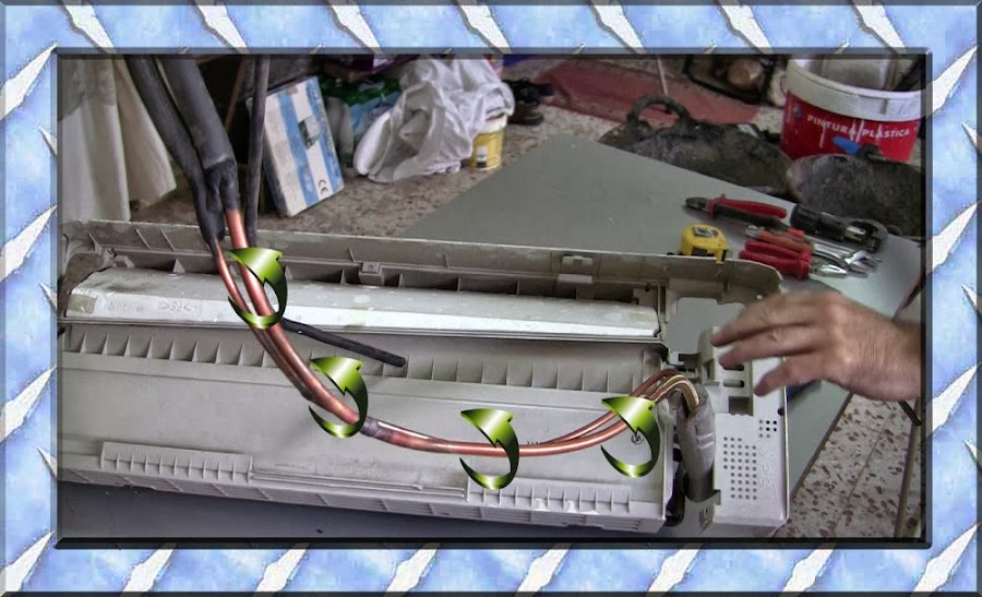 6. Tras este paso, damos la vuelta a la unidad del aire acondicionado, y cogeremos los tubos de cobre.