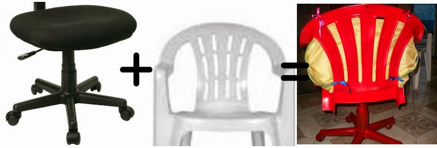 En este caso mi padre encontró tirados una base de silla secretarial sin asiento solo las ruedas y se lo llevo a casa pensando en hacer algo con ello, después encontró también tirada una silla plástica rota de las patas, a la de plástico le corto todas las patas y la unió con tornillos a la secretarial, el resultado es una silla nueva para el escritorio, después de lavada la he pintado y le puse un cómodo cojin, ahora es la protagonista de mi escritorio