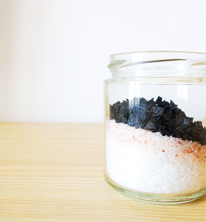 *Mezclad en un tarro diez cucharadas soperas de sal gorda, cuatro de sal rosa del Himalaya y cuatro más de sal negra.