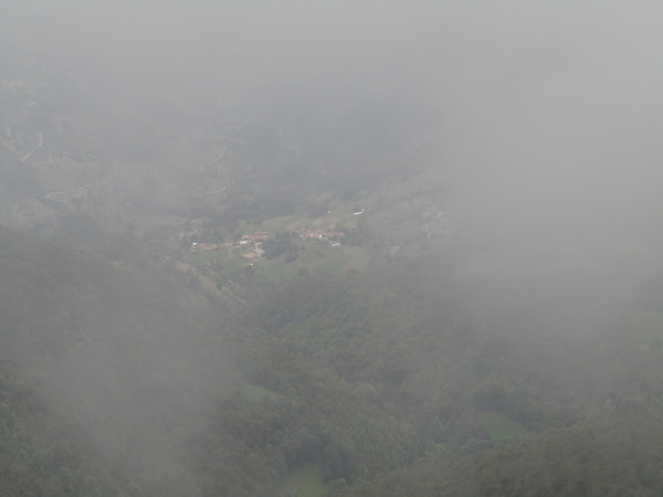 Primeros pueblos lebaniegos (posiblemente Ledantes o Barrio) que se empiezan a ver entre la niebla.