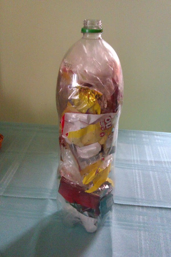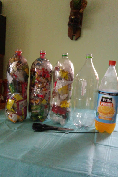 YA UNA VEZ PICADO TODO EL MATERIAL RECOLECTADO SE PROCEDE A LLENAR LAS BOTELLAS CON MUCHO PAPELILLO , Y CON LA AYUDA DE UN PALO PARA QUE SE VAYA OPRIMIENDO HACIA ABAJO.OJO.... NO ECHARLE PLASTICO NI PAPEL ALUMINIO,NI ENVOLTURAS CON RESIDUOS DE COMIDA,NI MATERIAL HUMEDO.