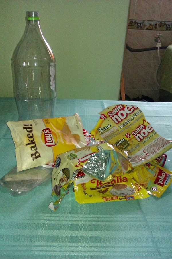 papitas dulces chucherías etc. , pues estas embolturas tardan muchos siglos en destruirsen en el planeta , así que poco a poco las vamos recopilando y así también se recicla.