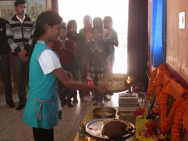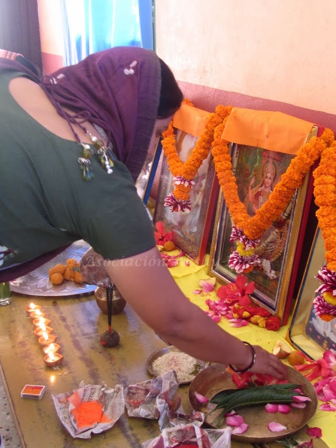 En la escuela Akshay, el pasado 4 de Febrero hemos celebrado este día con una puja (ritual hindu) en el cual se han hecho ofrecimientos a la diosa de velas, frutos e incienso y se ha cantado el mantra de Saraswati y canciones alegóricas.