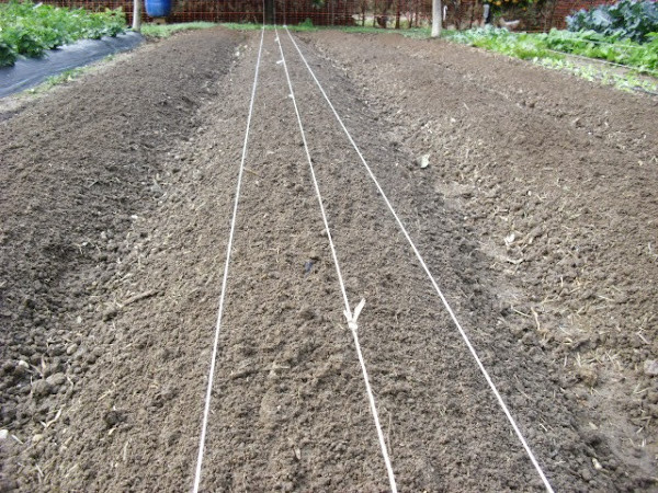 Tras darle varios pases con la moto-azada para dejar la tierra bien suelta, realicé la medición de la distancia entre los lomos, que ha sido de 0,80 cm. Tras ello, he colocado las lineas para aporcar la tierra y conseguir el objetivo. Tras apretar ligeramente la tierra y pesarle el rastrillo para darle la forma deseada, he conseguido obtener los lomos sobre los que se va a realizar la siembra de los ajos.