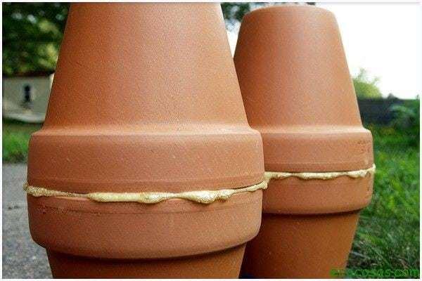 Una vez, que tapamos el agujero, debemos montar una maceta sobre la otra, y nuevamente utilizando silicona o algún otro pegamento, para que se mantengan unidas formando una sola pieza, también puede usarse cemento o mi favorito que es una mezcla de arcilla y tierra con la que hacemos un barro bien plástico, de usar el barro debemos dejarla secar un tiempo, y probablemente repetir el proceso al año siguiente pero bueno sería todo 100% natural.