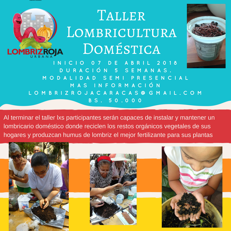Este 07 de abril 2018 se inicia en Caracas el II Taller de Lombricultura Doméstica a dictarse en la modalidad semi presencial. Consta de 2 clases presenciales en el Parque Los Caobos y 4 semanas de ejercicios que l@s participantes realizaran en sus casas con el acompañamiento vía internet y/o washapp de Lombriz Roja Urbana. Y en el costo del taller se incluye el Pie de Cría de más de 50 lombrices rojas y 350 gramos de sustrato (humus con cocones (huevos de lombriz).