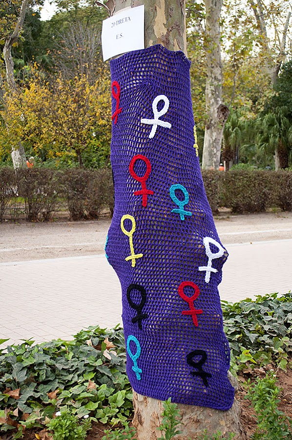 Esa mañana en Ribalta, solamente empleando cerca de 1000 ovillos en decorar árboles, se envían muchos mensajes: repulsa general en contra de la violencia de género. La necesidad de la prevención para que las generaciones que vengan no tengan que pasar el infierno que es actualmente. Y la petición de una ley que garantice la seguridad de las mujeres que tienen que vivir con semejante problema. Este año van 93 mujeres asesinadas a manos de sus maridos, ex maridos, novios o ex novios. Pero son muchísimas más, muchísimas, las que viven con terror a que alguien en quien depositaron toda su confianza siga humillándolas, despreciándolas, impidiéndoles hacer su vida normal, amenazándolas, y en el peor de los casos, pegándoles y o matándolas.