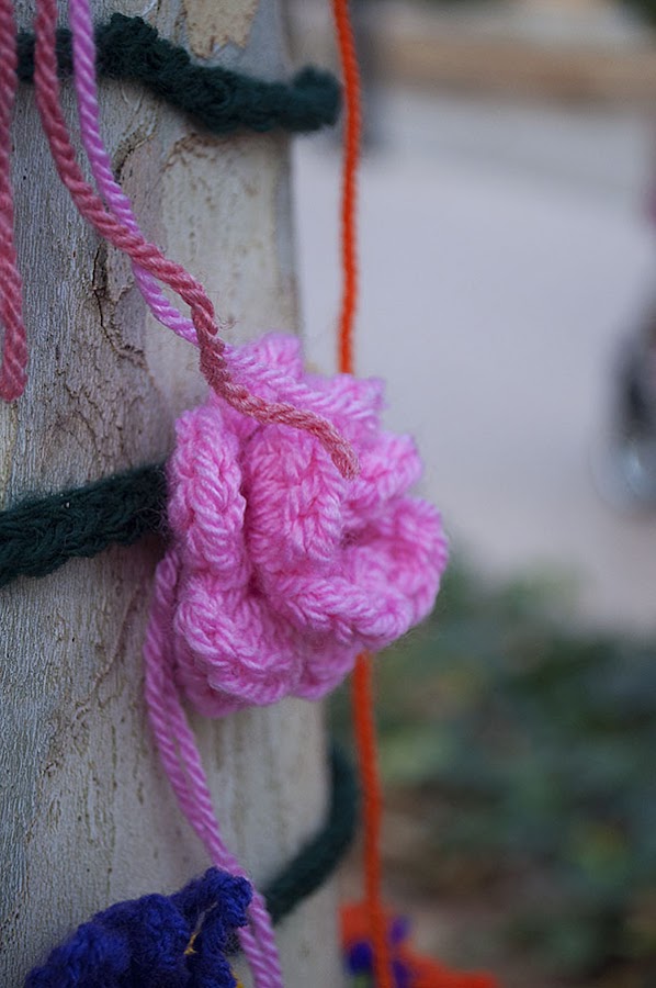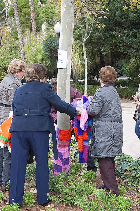 Con motivo del Día Internacional contra la violencia de género, el Ayuntamiento puso a tejer a muchísimas asociaciones y colectivos para conseguir cubrir todos los árboles del pasillo central del parque. A mí me avisaron de La oveja Lacha para colaborar con el árbol que le habían asignado, e hicimos muchas flores. Muchísimas flores. Para quien no sabía tejer les dieron unas clases introductorias e hicieron bufandas larguísimas en las que envolvieron los árboles. Otra gente las acompañó de pompones, otra hizo mandalas... aunque todas nos movíamos en la misma gama cromática hicimos cosas muy diferentes. No sé quién hizo bufandas con cara y se ocupó de las farolas.