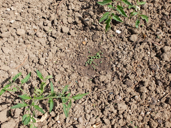 Por sus excelentes propiedades de repelentes de insectos maligno para nuestras tomateras, he intercalado entre las tomateras, tres piquetes de siembra de albahaca para dejar una sola planta en cada sitio equidistantes que dejare que se desarrollen juntos a las tomateras.