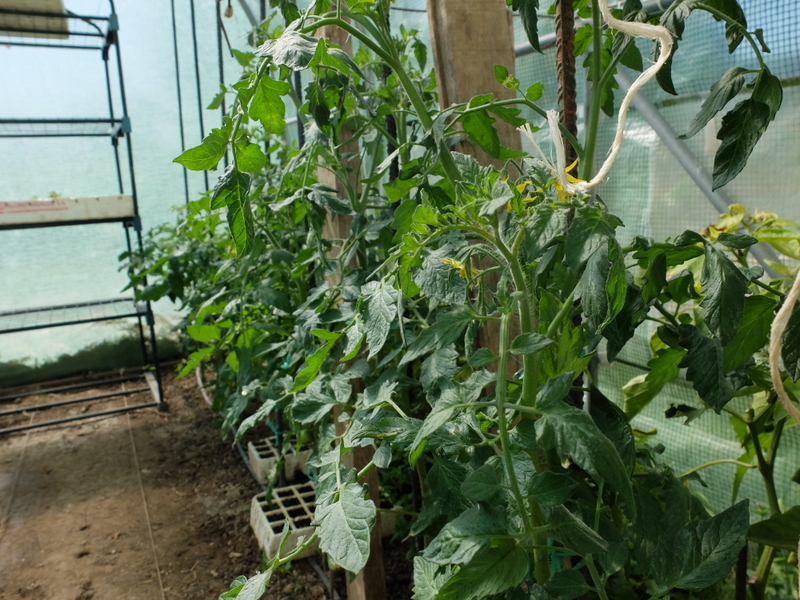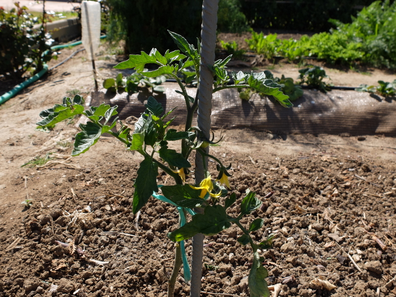 Este año no he querido utilizar la protección de plástico para adelantar su producción, pues tengo plantados tomates en el interior del invernadero muy adelantados, que ya tienen tomates verdes pequeños.