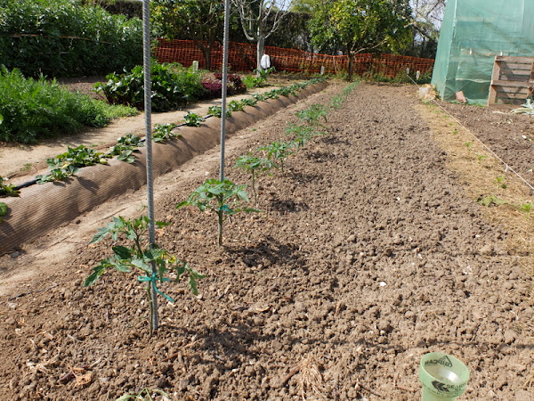Tras la preparación adecuada del terreno, con un buen aporte de estiércol, este año he probado con el de cabra y gallinaza juntos al 50% y con varias labores del motocultor para dejar el terreno lo mas liso y mullido posible. Con todo preparado, en la primera quincena de marzo, he realizado el trasplante de las tomateras.