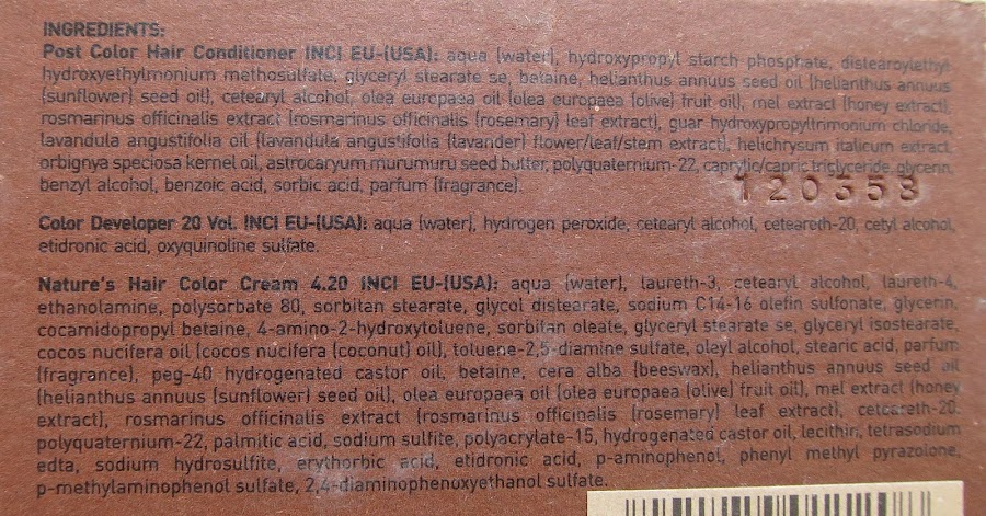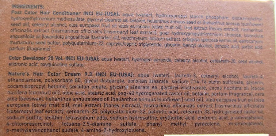 Natures Hair Color Cream 10.0 INCI EU-(USA): aqua (water), laureth-3 (tensioactivo no ionico alcohol etoxilado que se utiliza como emulsionante y surfactante que contiene óxido de etileno que es muy tóxico), cetearyl alcohol, laureth-4 (ídem -3), ethanolamine (también llamado MEA o monoetanolamina, emulsionante alergénico), polysorbate 80 (En su forma original, es un polisorbato sorbitol inofensivo, que es un alcohol de azúcar. Para su uso en productos de cuidado personal, sin embargo, se trata con óxido de etileno, por lo tanto, el nombre "polisorbato 80," porque se trata con 80 partes de óxido de etileno), glycol distearate (compuesto químico se utiliza como emoliente y es una combinación de etilenglicol (químico incoloro) y ácido esteárico (un ácido graso común). También tiene una alta capacidad de formación de espuma, por lo que puede encontrar en el jabón líquido o desinfectante para las manos, así como en los baños de burbujas y jabones líquidos. Aunque generalmente se considera seguro, este ingrediente se queda corto en comparación con las alternativas naturales), sorbitan stearate (tensioactivo de origen vegetal), sodium C14-16 olefin sulfonate (tensioactivo generalmente derivado del coco potencialmente irritante de la piel y por eso se añaden otros componentes para minimizar su impacto negativo en la piel), glycerin (no se puede determinar si es vegetal -cosa que se indicaría- o de origen sintético), cocamidopropyl betaine (también se llama tegobetaína de coco. Es un tensioactivo para que en las fórmulas elaboradas con otros aniónicos fuertes sean menos agresivos. Es un tensioactivo suave y su problema radica en su procedencia dependiendo si es de origen natural o de síntesis. Si es de síntesis suele estar contaminado con nitrosaminas que son las verdaderamente irritantes, contaminantes y cancerígenas), sorbitan oleate (surfactante contaminante ambiental), glyceryl stearate se (autoemulsionante clasificado como bajo riesgo), glyceryl isostearate (emoliente y agente espesante. confiere sensación de suavidad a la piel), cocos nucifera oil (aceite de coco), oleyl alcohol (alcohol graso emulsionante y tensioactivo procedente generalmente del aceite de pescado), stearic acid (emoliente y agente que ayuda a mantener la fórmula. generalmente es de origen animal), parfum (fragrance. ufff. aquí ya nos vamos a cientos de sustancias que necesitamos horas y horas de análisis), betaine (agente acondicionador del cabello y antiestático. se suele sustituir a la tegobetaína porque es más suave. suele ser de origen vegetal), peg-40 hydrogenated castor oil (agente emoliente mezcla de aceite de ricino con polietilenglicol -PEG- de origen sintético petroquímico que penetra en el piel y favorece que el resto de sustancias también lo hagan), cera alba (beeswax. Cera de abejas), helianthus annuus seed oil (aceite de girasol), olea europaea oil (aceite de oliva), mel extract (extracto de miel), rosmarinus officinalis extract (extracto de romero), ceteareth-20 (emulsionante derivado del petróleo), polyquaternium-22 (agente antiestatico sintético. Son compuestos de amonio cuaternario que son caústicos e irritantes de ojos, pueden producir dermatitis de contacto), palmitic acid (surfactante emulsionante que generalmente es de origen animal), polyacrylate-15 (derivado del petróleo, tapona los poros, contaminante ambiental), hydrogenated castor oil (aceite de ricino y agua que se utiliza como emulsionante), sodium sulfite (es una sal que se utiliza como conservante. Altera la estructura del cabello), lecithin (emulsionante, humectante, estabilizante. puede ser de origen vegetal -soja- o animal), sodium hydrosulfite (sal inorgánica que reduce la viscosidad), tetrasodium edta (aditivo quelante que se acumula en el organismo que además es bastante dificil eliminar ya que se une a metales pesados y forma compuestos difíciles de degradar), etidronic acid (ácido inorgánico que se utiliza como agente quelante para que arrastre residuos), erythorbic acid (conservante antioxidante derivado de la vitamina C), toluene-2,5-diamine sulfate (sulfato que se utiliza como agente colorante del cabello cuando se oxida con el peróxido de hidrógeno), 4-chlororesorcinol (es un benceno -componente petróleo- que se utiliza como colorante para el cabello, puede influir en el sistema inmunológico y es xenoestrógenico), 2-methylresorcinol (es un benceno -componente petróleo- que se utiliza como colorante para el cabello, puede influir en el sistema inmunológico y es xenoestrógenico), phenyl methyl pyrazolone (colorante sintético), m-aminophenol (colorante sintético para colorar el cabello producido a partir del petróleo), p-methylaminophenol sulfate (colorante sintético), 2,4-diaminophenoxyethanol sulfate (componente para colorear el cabello).