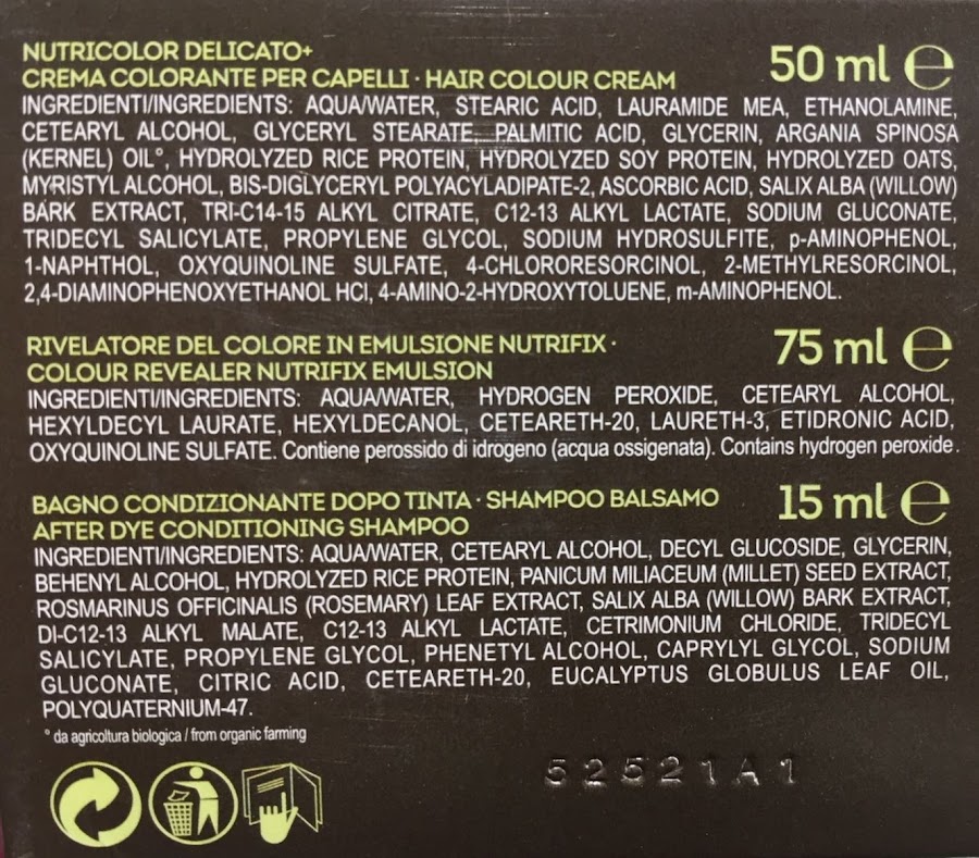Color Developer INCI EU-[USA]: Aqua, Hydrogen Peroxide (agua oxigenada), Cetearyl Alcohol (emulsionante de un alcohol graso vegetal), Ceteareth-20 (emulsionante derivado del petróleo), Cetyl Alcohol (estabilizante alcohol ceroso), Etidronic Acid (ácido inorgánico quelante que ayuda a retirar el producto por su propiedad corrosiva), Oxyquinoline Sulfate (se utiliza como estabilizante del agua oxigenada, irritante para los ojos en estudios y posible carcinogénico).