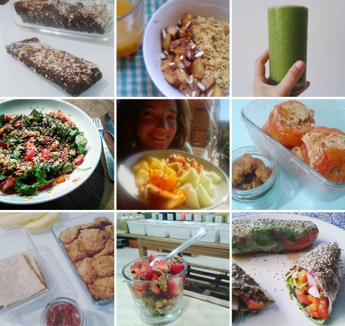 Diariamente como alimentos sanos, enteros y frescos. No recurro a nada extravagante. Me alimento de cereales integrales, legumbres de todos los tamaños y colores; muchas frutas, verduras y hortalizas, frutos secos y semillas. Ah, y levadura nutricional… ¡deliciosa fuente de vitamina B12! Acá puedes ver mi primera edición de lo que como en día.