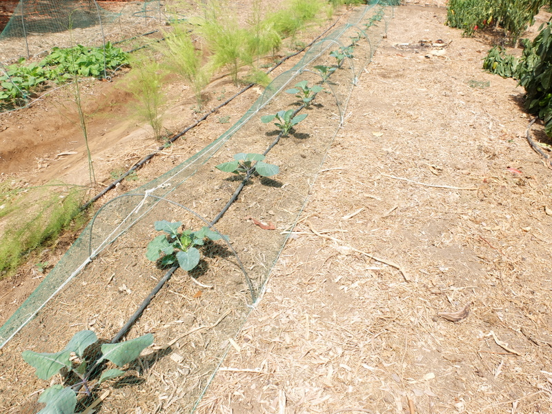 Una realizado el trasplante y simplemente como media de seguridad, he colocado unos arcos y sobre ellos, he extendido una red de malla verde. El motivo es para protegerlo de la gran cantidad de pájaros que hay por el huerto y de las gallinas, asegurando así que las hojas no sean picoteadas y el crecimiento de las plantas sea el adecuado en esta primera fase de su crecimiento.