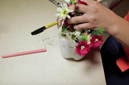 6. Añade las flores que más te gusten tanto artificiales como naturales. Si son naturales haz una agujeros abajo para poder regar bien la planta.