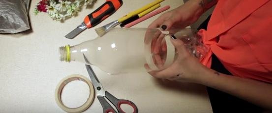 Además será perfecta para decorar una terraza o tu habitación (si utilizas flores artificiales). ¡No hay escusas para no reciclar! así que pasemos de botella a macetero 1. Con una cinta adhesiva vas a marcar la altura que quieras que tenga tu macetero, para ello rodea con la cinta la botella de plástico. 2. Dibuja dos triángulos en la cinta que serán las orejas de nuestro gatito. Procura que queden alineados con las patas de la botella.