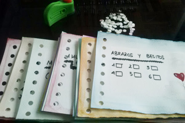 Cuando tenemos esta parte lista, nos toca perforar las hojas para poder encuadernarlas. Yo suelo reciclar los gusanos de libretas y cuadernos. Cuando gasto uno, le quito el gusano para poder reciclar el papel y los guardo. Si no tenéis, podeís encuadernarlo pasando una cinta de tela o cuerda. Quedará genial y ya tenéis el regalo perfecto!