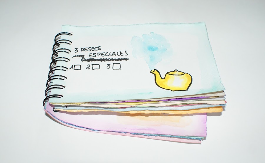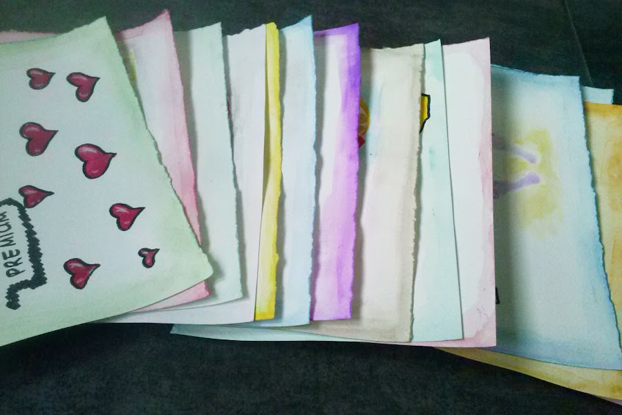 Adornamos las esquinas de cada hoja con el diseño que más nos guste, y en este caso he usado acuarelas y he coloreado ligeramente los bordes de diferentes colores.