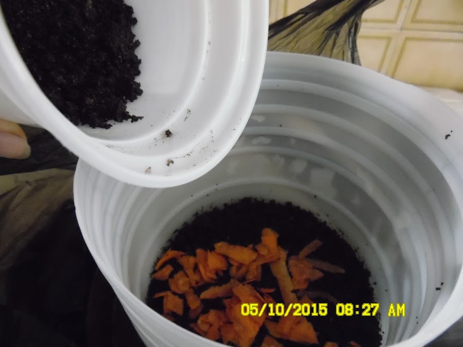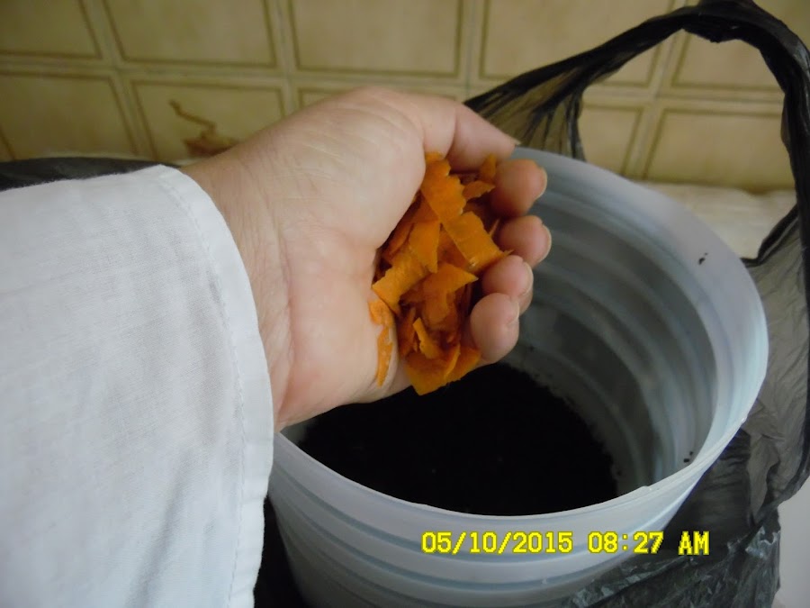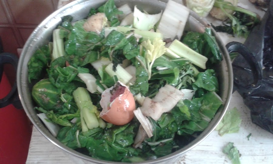 Y claro su comida favorita, son nuestros restos vegetales frescos. Nosotras le decimos de manera genérica las "conchas". Pero como veran es mucho más. Son las conchas y restos (no importa que esten dañados) de papa, de tomate, calabacin, pepino, cebollín, remolacha, zanahoria, las conchas de alpiste, las conchas de girasol, las hojas del maíz de los bollitos, las hojas de platano, etc. Las conchas de huevo, la valioosisima borra de café, el cartón de los envases de los huevos, las hojas de los cuadernos que vamos a botar y papel periódico.