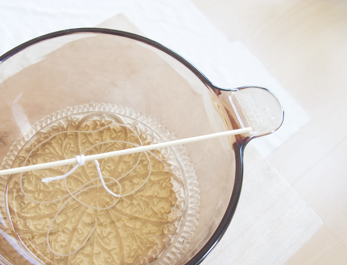 *Podéis comprar la mecha hecha, pero si no tenéis os enseño como prepararla. Atar en un palo (palillos largos, palillos chinos?) un trozo de hilo de algodón grueso. Fundir 250 g de cera de soja, vigilando que esta no supere su temperatura de fusión, sobre los 55ºC, para que no se escarche. Cuando la cera esté fundida, dejar el palo reposando sobre los extremos del recipiente unos segundospara que el cordón se empape bien de cera. Sacar el hilo y dejarlo solidificar en posición vertical, por ejemplo dentro de una botella de agua de plástico vacía.