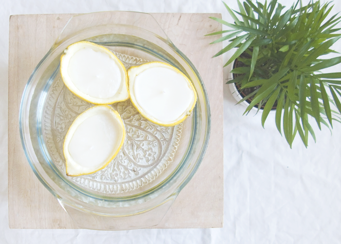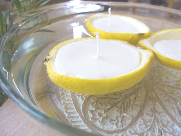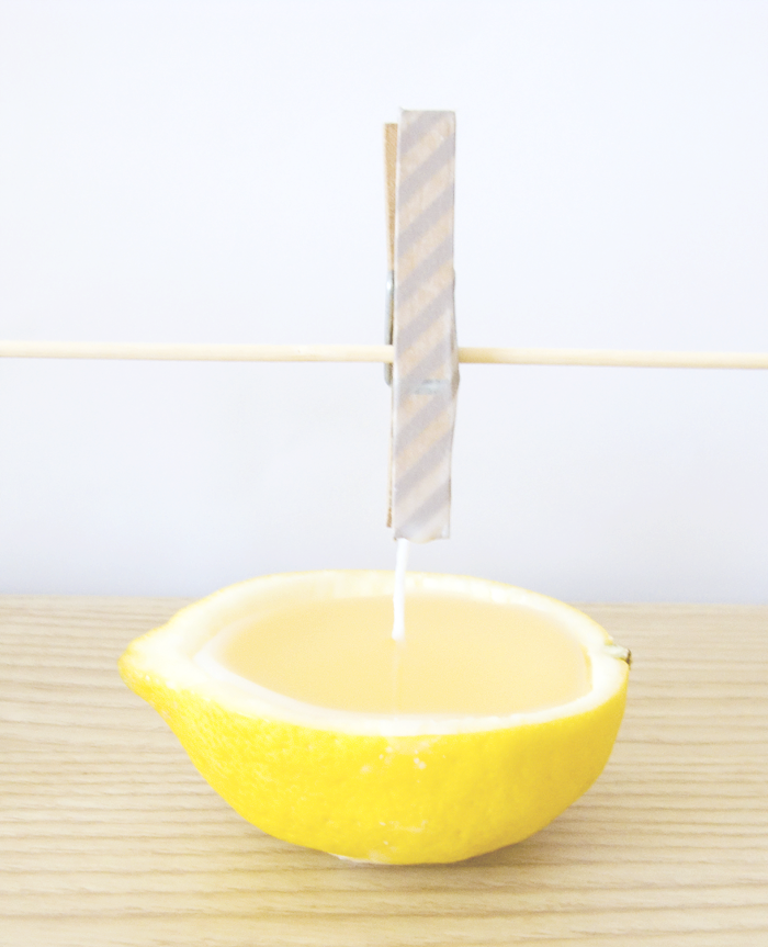 *Cortar la mecha ya sólida en trozos de unos 7-10 cm y colocarla verticalmente sobre los limones con ayuda del palo anterior y una pinza de la ropa (es importante que toque el fondo del limón). Rellenar los limones con la cera y esperar a que se solidifique. Dejar que la mecha sobresalga unos 3 cm y cortar lo que sobre.