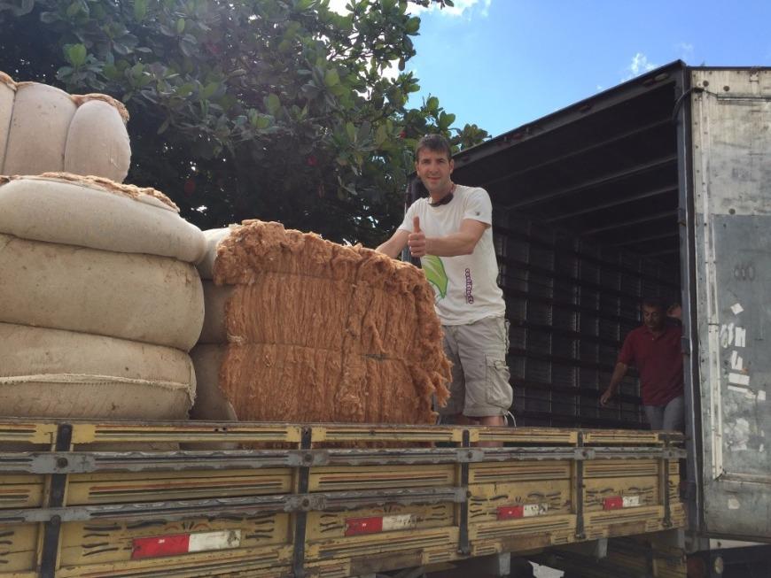Las balas pesan 70 kg y se dejan manejar “a duras penas”. Su volumen no permite hacer un recorrido de 60 metros a pie hasta el camión. Tuvimos que pedir prestado un carrito de carga en un supermercado para poder sacar esas balas con cierta dignidad y contratar un grupo de jóvenes para manipular el material y hacer la carga en el transporte que lo llevaría hasta el puerto, allí ya es otra historia y al menos están equipados con carretillas para manipularlo todo debidamente.